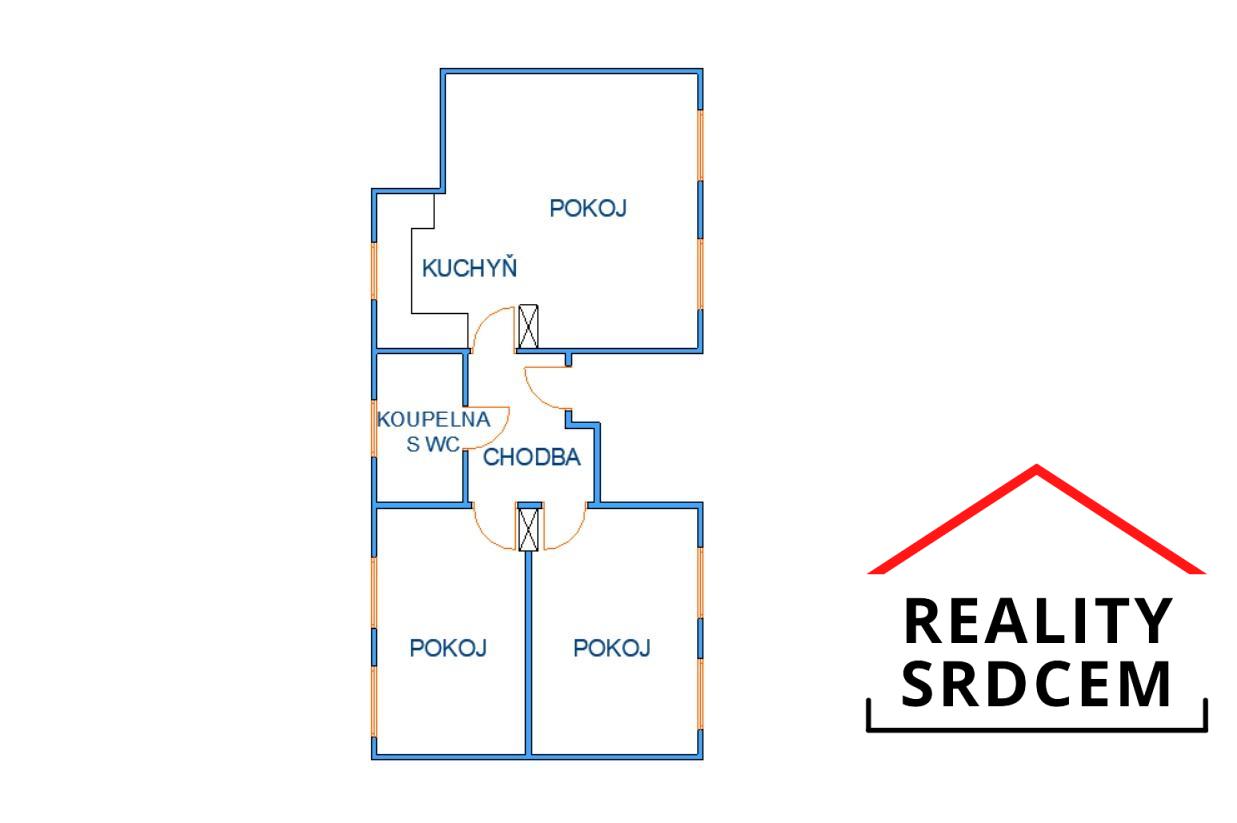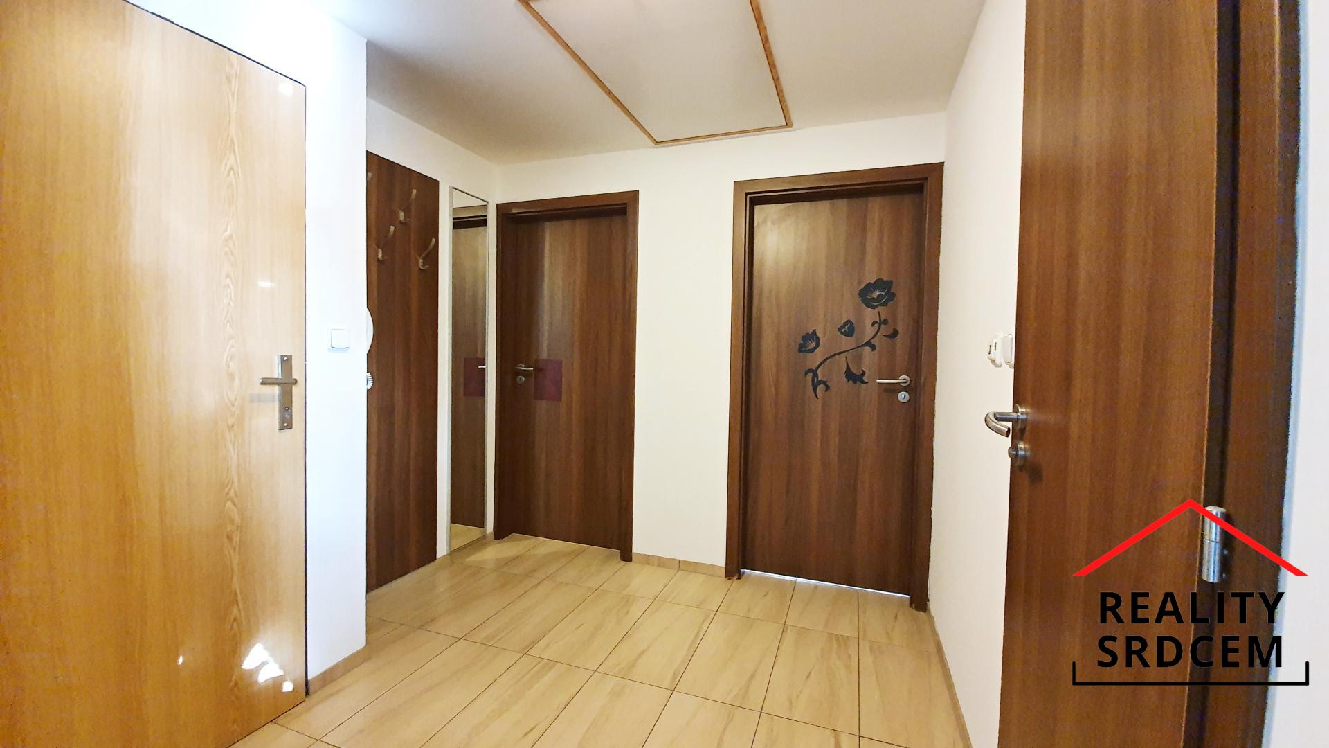 Při vstupu do bytu se nacházíte v předsíni, ze které se po pravé straně vchází do obývací pokoje s kuchyňským koutem, naproti je situována koupelna s toaletou, a po levé straně jsou dvě samostatné ložnice.