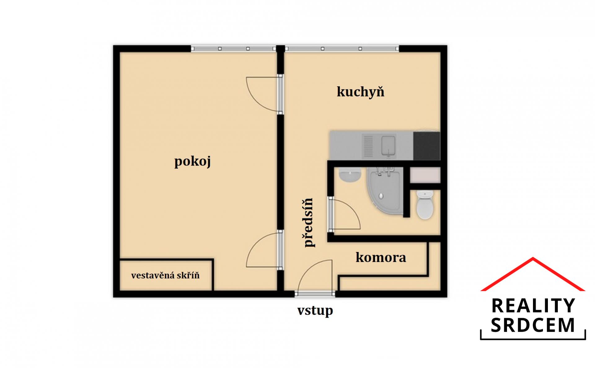 Jeho dispozice se řadí mezi ty velmi dobře řešené z důvodu prostorné kuchyně i samotného pokoje. Jako benefit můžeme označit komoru v předsíni, která nabízí dostatek úložného prostoru.