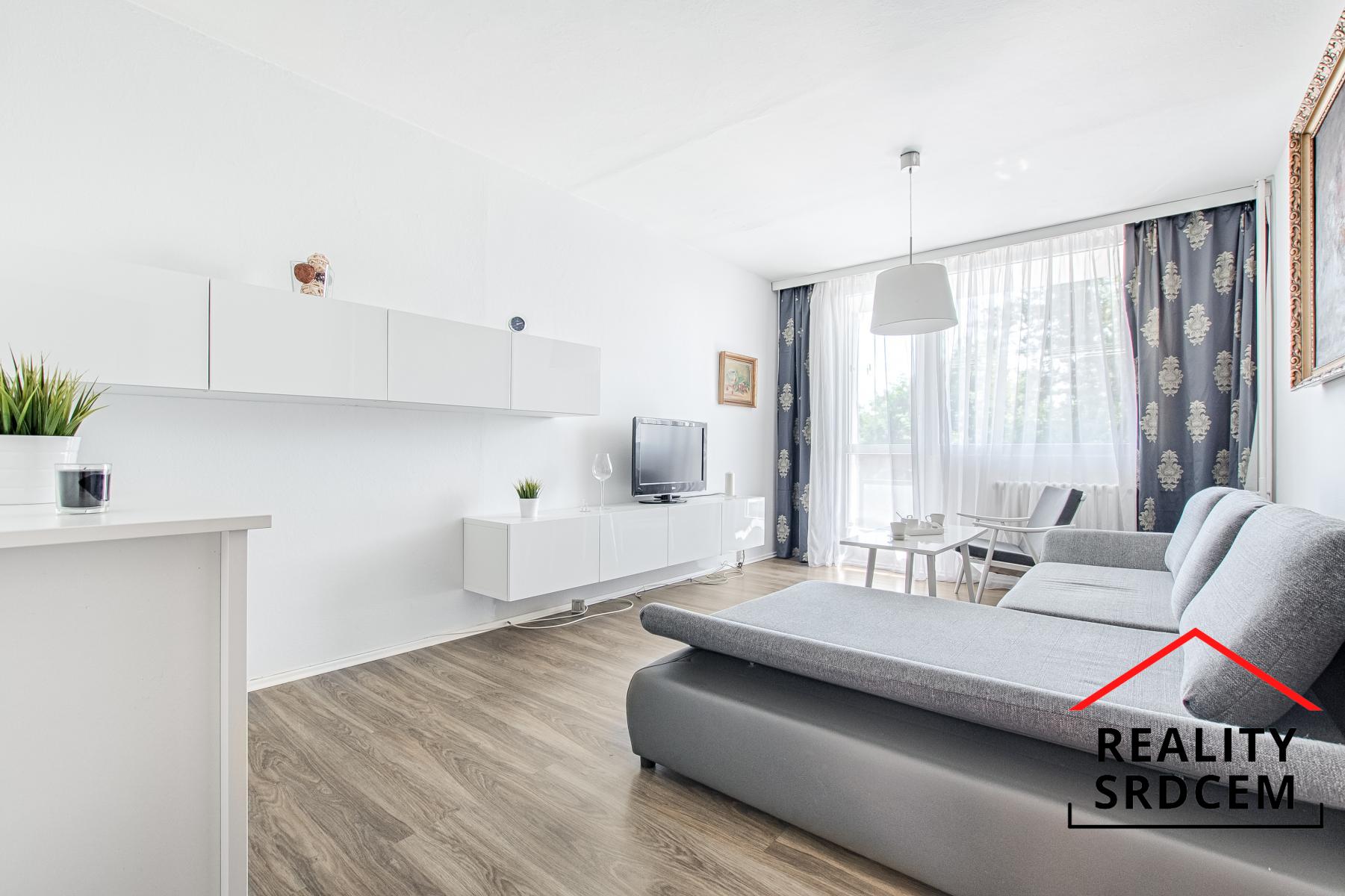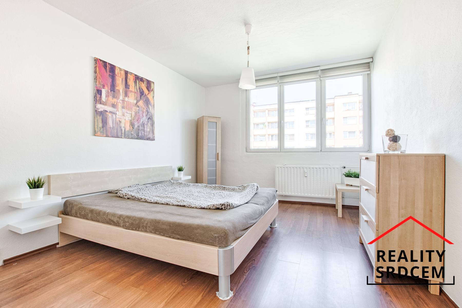 K vybavení bytu patří kuchyňská linka s vestavěnými spotřebiči včetně digestoře a lednice, dále jídelní stůl se židlemi, obývací nábytek, televize, dvoulůžková postel, komoda, šatní skříně a počítačový stůl, ovšem bez sedaček v obou pokojích. Součástí pronájmu je také sklep.